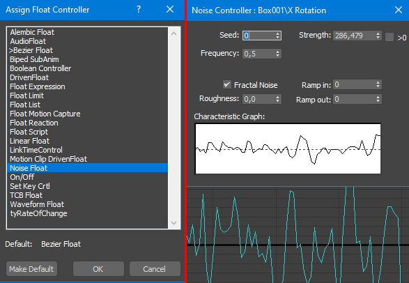Controllers come in many types that correspond to different types of animations. To change the type of the controller, right-click the animated parameter and choose Assign Controller in the drop-down menu. For example, assign a ‘Noise Float’ controller to the rotation parameter and see how it affects the object. Noise Float doesn’t work through key frames as it is parametric, however it is possible to change its shape through its properties. Double-click any assigned controller to see its properties (if they are available).