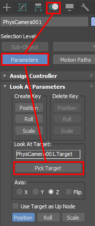 A different way of getting the same result would be to instead link the target to the cone. Create another camera and select its target. In the Motion tab in the offered hierarchy, choose the Position parameter and click the icon above. In the new menu, select Attachment, then Pick Object and click on the cone. In PRS Parameters, click on the Position button to create the key frame. Play the animation again - both cameras are following the cone.