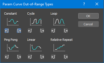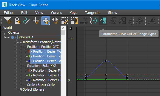 Create a simple animation of a ball going up and down on frames 0, 10, and 20. Now, we want it to continue bouncing until the end of the timeline. Go to the Graph Editor, select the changing transform axis, and click the icon for Parameter Curve Out-of-Range Types.
