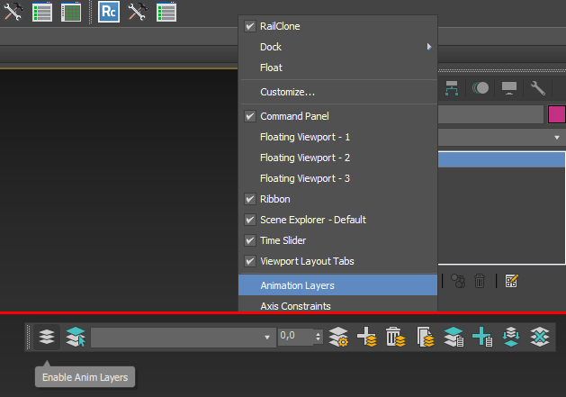To use animation layers, you first have to activate them for the selected object. Add a layers toolbar to the 3DS MAX interface by right-clicking on an empty space in any toolbar, then activate the ‘Animation Layers’ checkbox or go to the main menu Animation -> Animation Layers. This toolbar can be docked the same way as any other toolbar. The first icon enables animation layers for the selected object, so you can start setting up different animations.