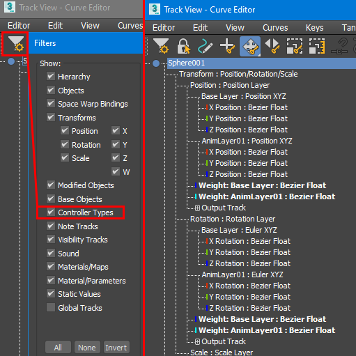 Behind the scenes, all the 3DS MAX animation is handled by controllers. Each movement, rotation, scaling, and material change is assigned its own controller. The curves in the Curve Editor are actually the representation of Bezier controllers applied by default. To see the name of the controller applied to each action, click the Filters icon in the Curve Editor and activate the ‘Controller Types’ option. You can see that both position and rotation controllers are Bezier.