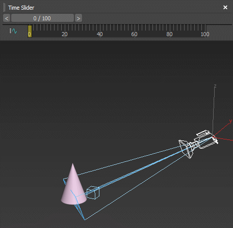 Here’s an example of how to add 3DS MAX constraints to your scene. Create any basic object, for example a cone, and set up some key frames of it moving around the scene. Now create a camera and position it to look at the object. Open the Motion menu next to the Create, Modify, and Hierarchy tabs. This is where constraints are applied. Right now the camera already has a LookAt constraint applied and the object it is following is the camera's target. Let’s change the target to be our cone. In Pick Target, choose the cone. In PRS Parameters, create a key frame by clicking the Position button. Now if you play the animation, you will see that the camera is turning to follow the cone’s movement.