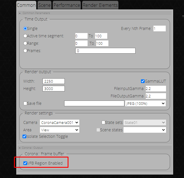 Now you can render the rendering region you initially set in V-Ray or Corona renderer frame buffer.